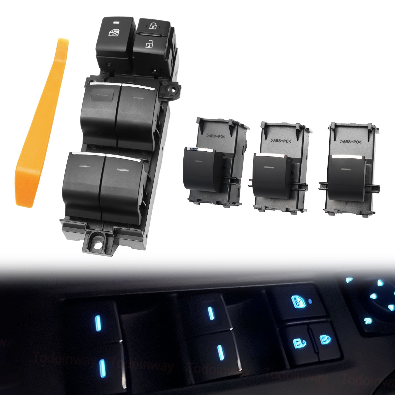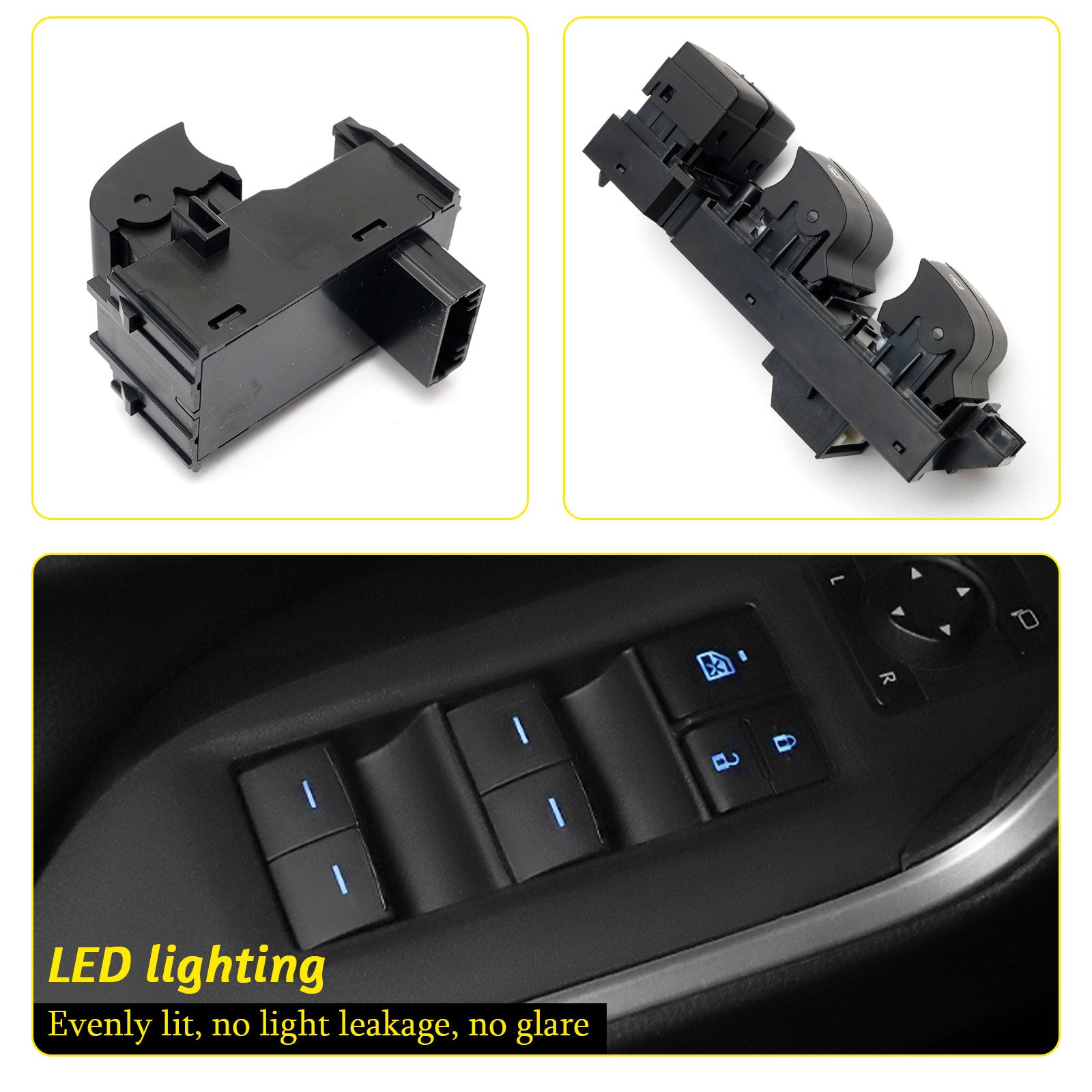- 【Excellent Design】: The main window control buttons feature a silent design, operating with minimal noise, creating a peaceful and comfortable driving environment. Each button is equipped with a blue LED indicator light, allowing for quick location even in dimly lit conditions, convenient for night use. This power window switch works without additional wiring, is easy to install, and the headlight switch is connected to the door switch, with the LED light on the switch illuminating only when the headlight switch is turned on.