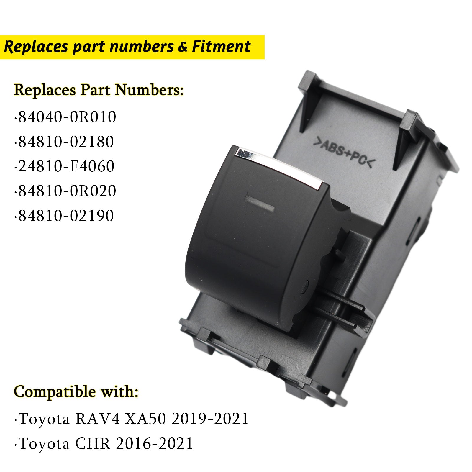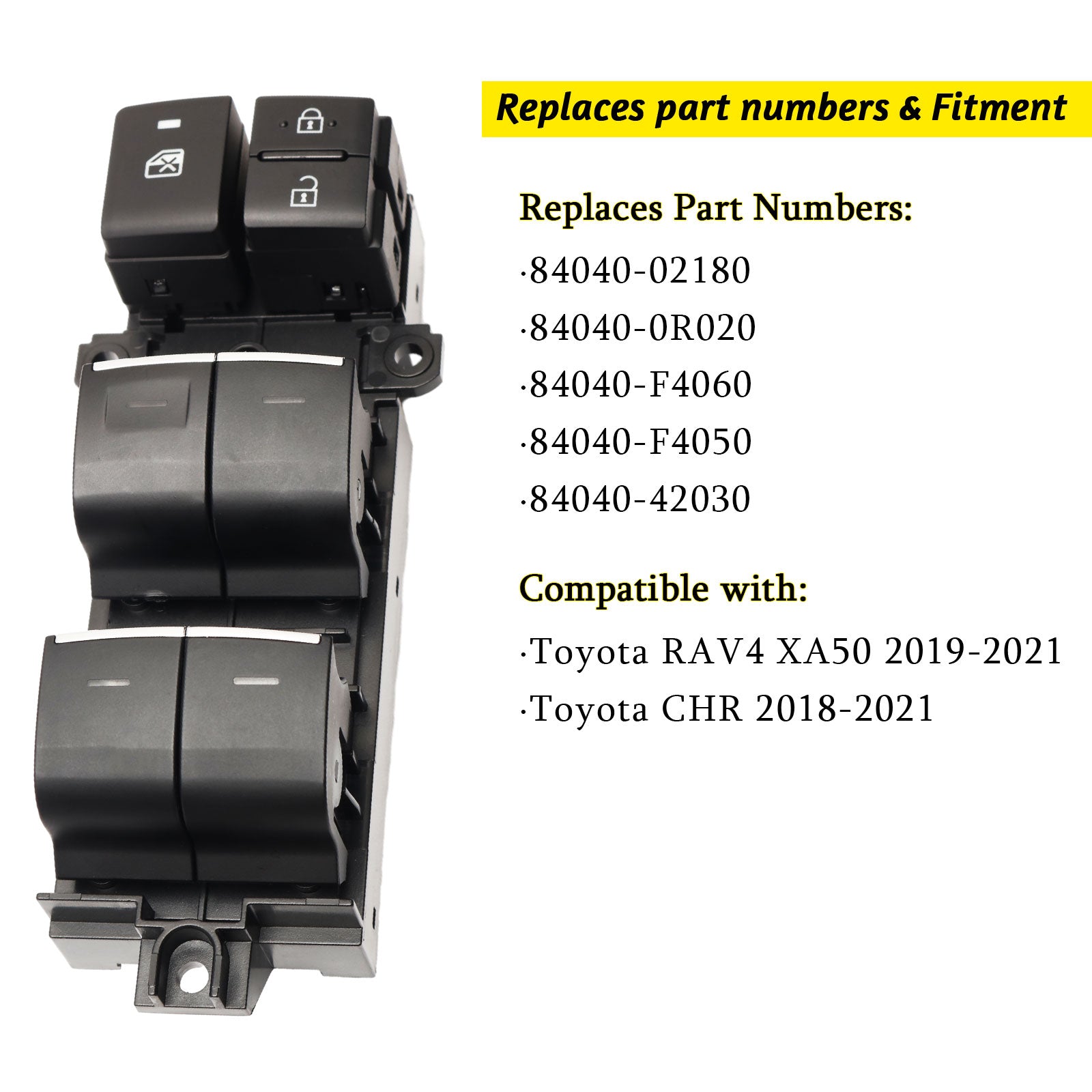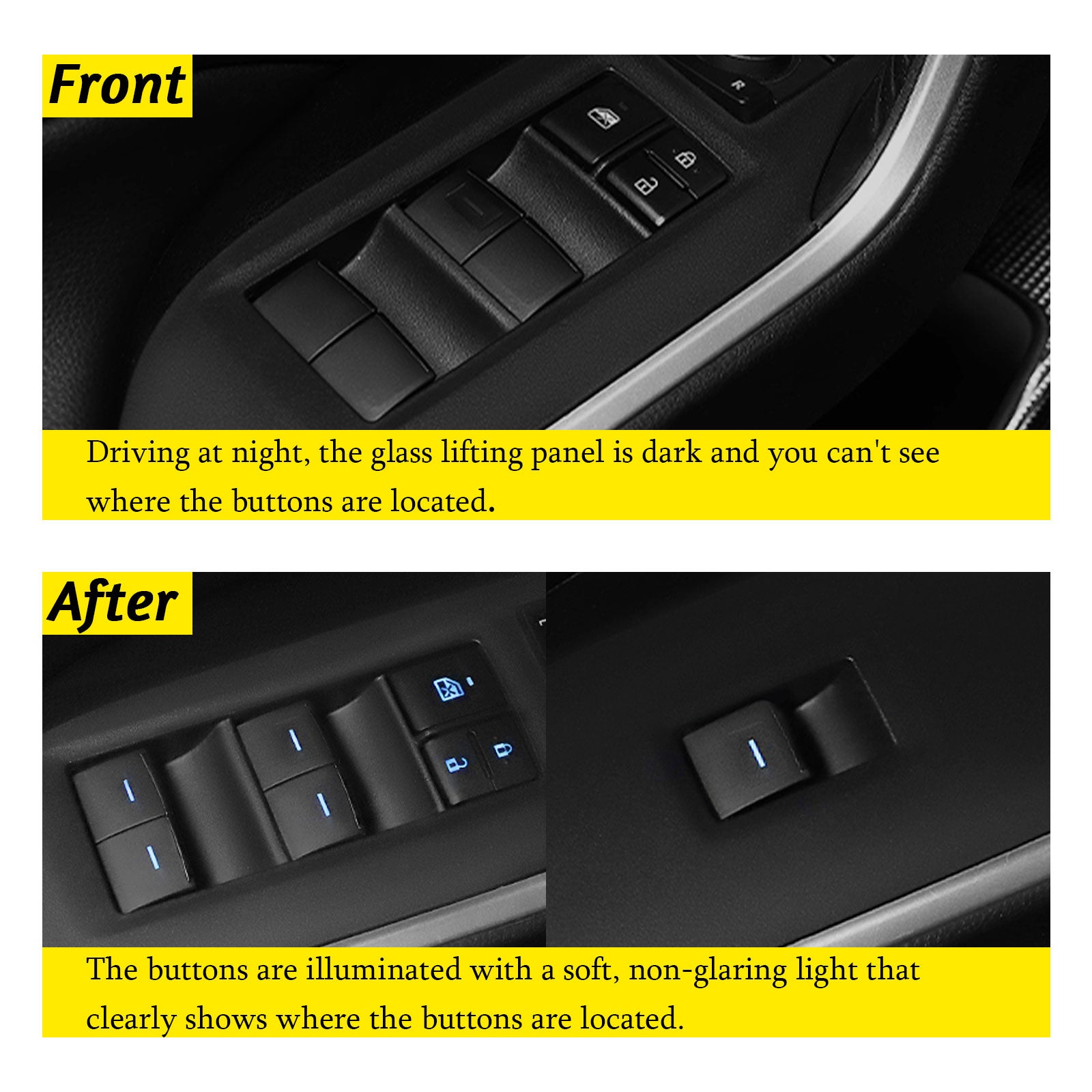 - 【Compatible Accessories】: Our LED power window switches address the issue of original non-luminous buttons being difficult to identify in the dark by introducing conspicuous LED lights, enhancing the convenience and safety of nighttime driving. Compatible with Toyota RAV4 XA50 (2019-2021), C-HR (2016-2021), Camry (2018-2024), Bz4x (2023-2024), Corolla (2019-2024), and Corolla Cross (2022-2024) models. Before purchasing, please verify that the product style matches your vehicle's original parts to ensure a seamless replacement. Our product is meticulously designed for superior user experience in terms of compatibility, functionality, and appearance.