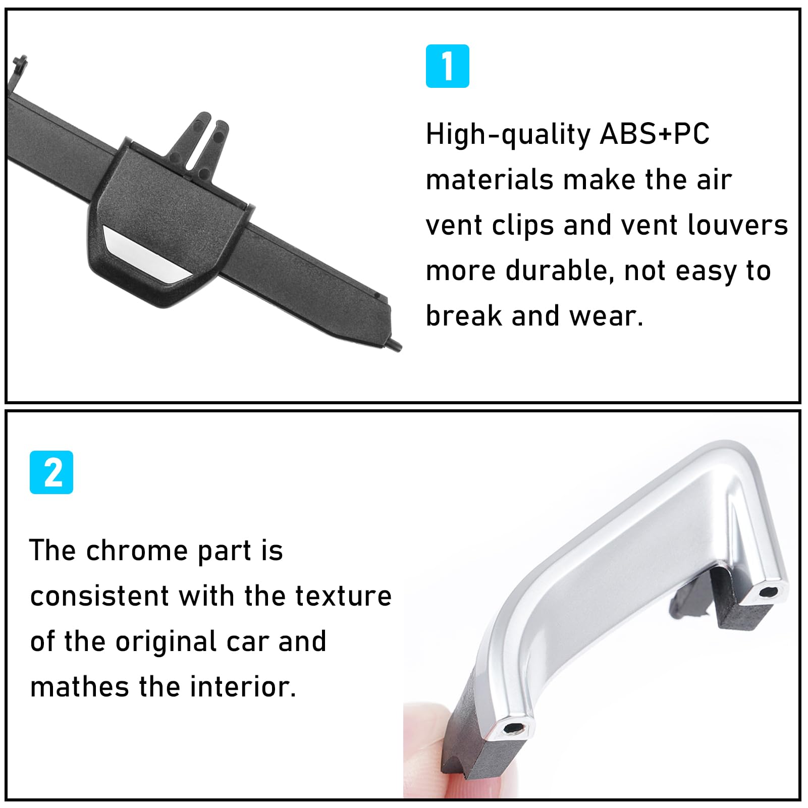 【Enhanced Intensity】The Air Vent Clips Tab is designed according to factory parts to ensure seamless fit. And the structure of the easily-broken part is upgraded by revising the connector of vent clips, far more solid than the original one. Unlike other brands, our vent clips allow you to have full motion of vent louvers up and down and can close vent like original tabs can do.