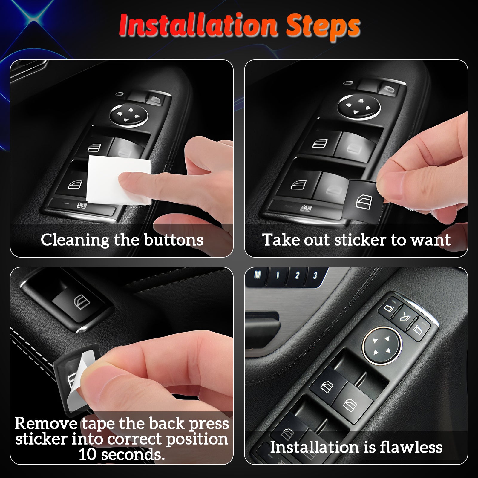 - đăNo-drill InstallationăThe 14 Pieces Car Window Glass Lift Button Stickers are reliable in quality.Easy installation.First clean the surface to be bonded and keep it dry.Then tear off the tape behind this replacement Window Button stickers.Align the positions and glue them.A small change give your car interior a Brand New Look.Note:Highly recommended to heat it with a hot air blower or other heating equipment for a few seconds to make it stickier.Leave it for a while after installation.