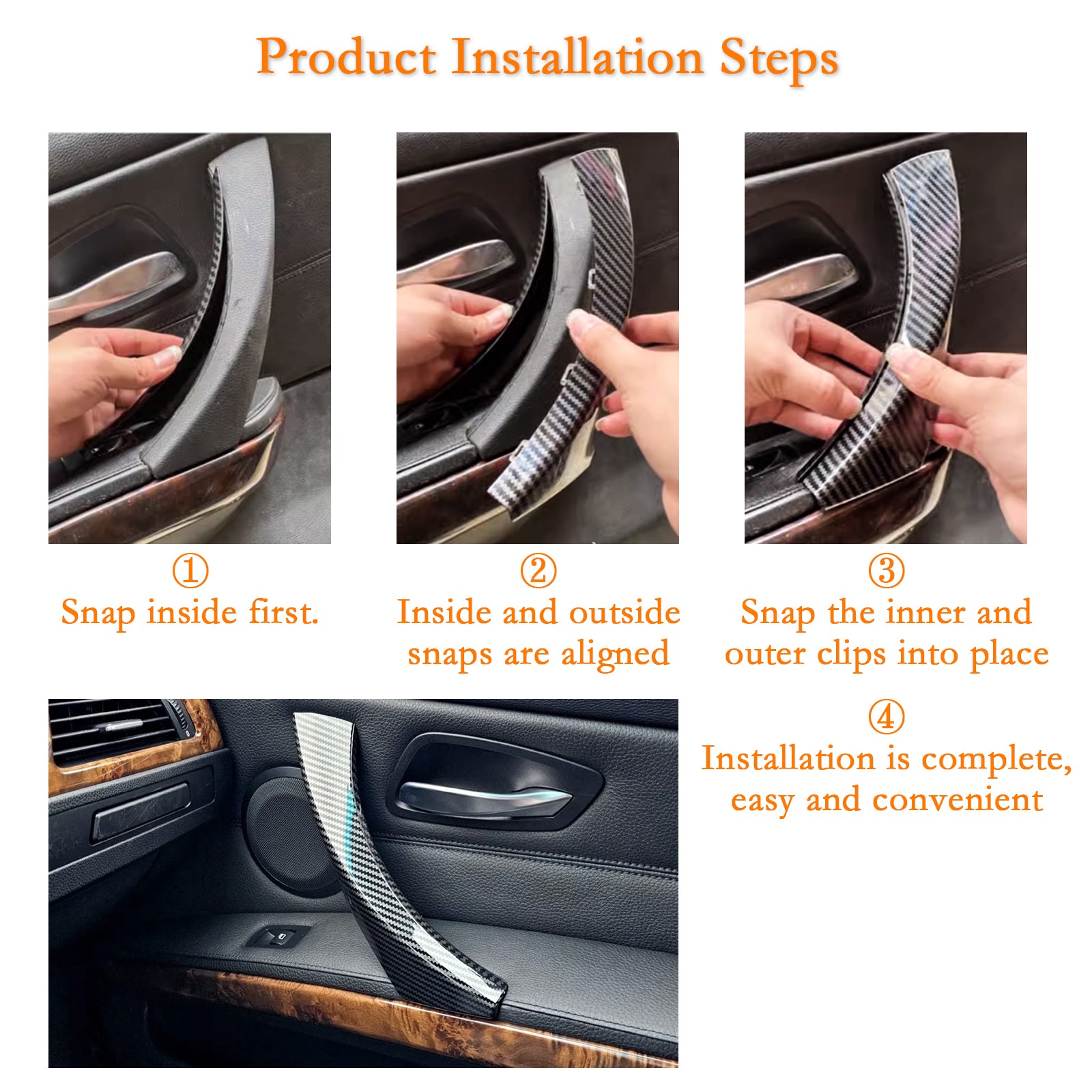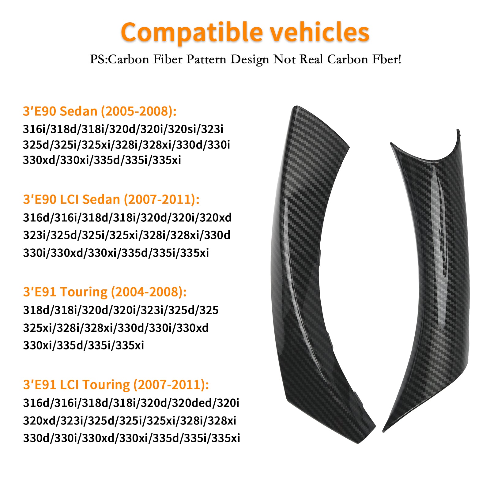 Car Door Handle Covers Compatible with BMW 3 Series E90 LCI/E91 LCI 316d, 316i, 318d, 318i, 320d, 320i, 320xd, 323i, 325d, 325i, 328i, 330d, 330xi, 335d, 335i, 335xi Sedan/Wagon (2007-2011) and BMW 3 Series E91 Wagon (2004-2008): 318d, 318i, 320d, 320i, 323i, 325d, 325i, 325xi, 328i, 328xi, 330d, 330i, 330xd, 330xi, 335d, 335i, 335xi.
